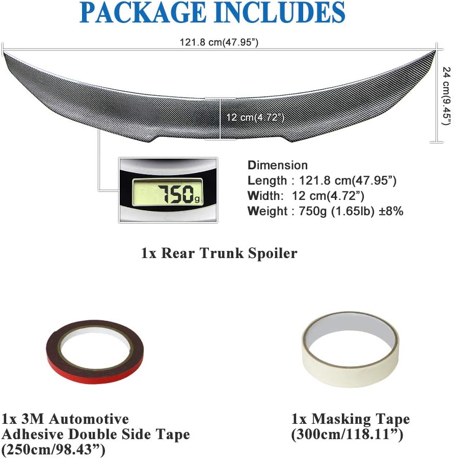 - Package includes: Real Carbon Fiber trunk spoiler x 1 pc, Adhesive double-sided tape x 1 pc and Masking tape x 1 pc
