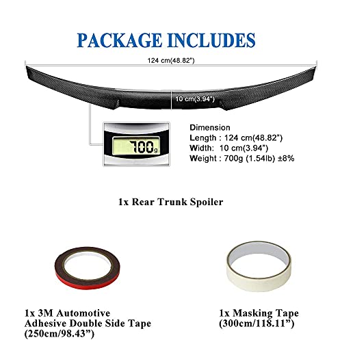 - Package Includes: Real carbon fiber trunk spoiler & Adhesive double-sided automotive tape & Masking tape; Easy Installation: No drilling or modifications is required.